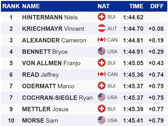 Компанию Хинтерманну на подиуме составили австриец Винсент Крихмайр и канадец Александер Кэмерон. Лидер общего зачета Кубка мира, швейцарец Марко Одерматт, лишь седьмой.