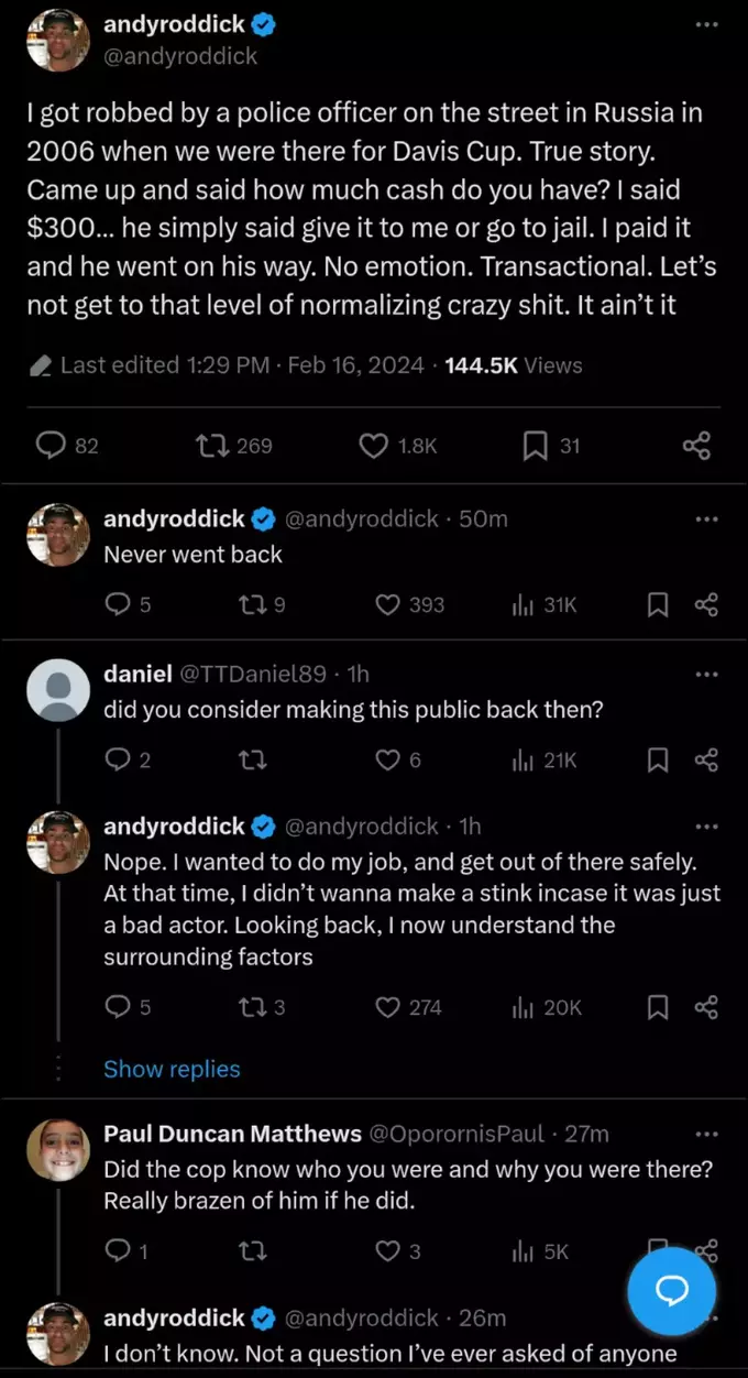 «В 2006 году на улице в россии меня ограбил полицейский, мы приезжали туда играть на Кубок Дэвиса. Это правда. Просто подошел и спросил, сколько у меня наличных денег. Я сказал, что есть 300 долларов... Он просто ответил, мол, отдай мне их, или сядешь в тюрьму. Я отдал, и он пошел своей дорогой. В общем никаких эмоций. Деловой. Давайте не будем доходить до такого уровня нормализации безумного дерьма. Так не должно быть. Никогда не вернусь туда.