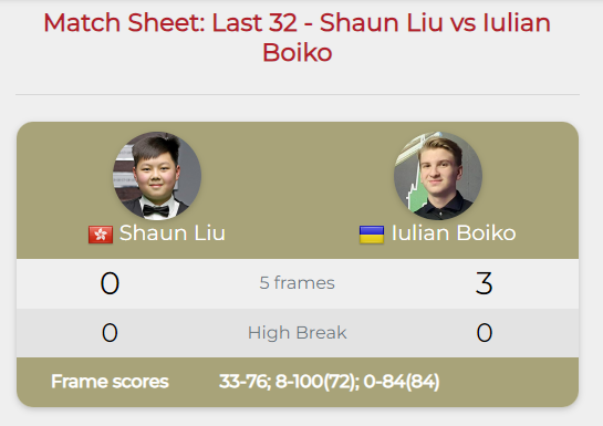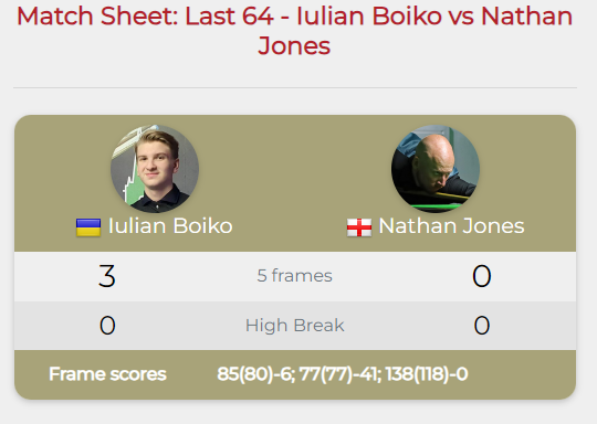 На стадии 1/32 финала Юлиан Бойко разгромил Натана Джонса из Англии (3:0), выполнив брейки в 80, 77 и 118 очков.