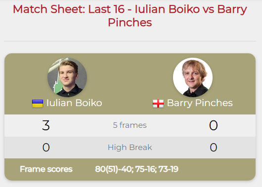 Наконец, вечером в 1/8 финала Бойко играл против 53-летнего английского ветерана Барри Пинчеса и снова одержал победу в трех фреймах (3:0), сделав одну полусотенную серию (51 очко).