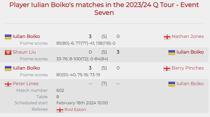 Ранее Юлиан Бойко проиграл на стадии 1/32 финала Welsh Open 2024 в поединке против Гэри Уилсона из Англии (2:4).
