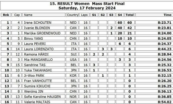 Таким образом, Схаутен выиграла уже два золота первого из чемпионатов мира в нынешнем сезоне. Второе место заняла канадка Ивани Блонден, а замкнула призовую тройку еще одна спортсменка из Нидерландов Мерайке Хруневауд.