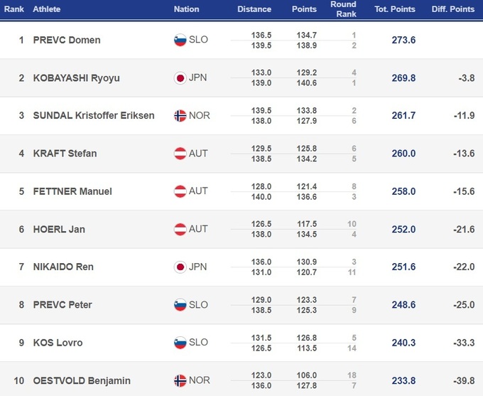 Вторым, как и во вчерашних соревнованиях, стал хозяин трамплина, японец Рёю Кобаяси. Топ-3 замкнул норвежец Кристоффер Эриксен Сундал.