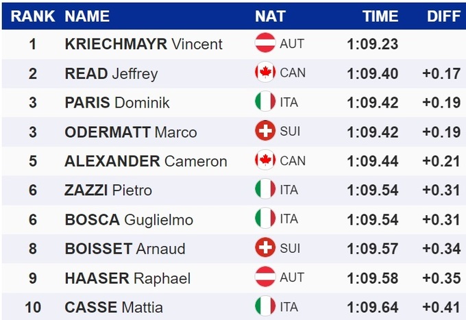 Вторым стал канадец Джеффри Рид, третье место разделили итальянец Доминик Парис и лидер Кубка мира, швейцарец Марко Одерматт.