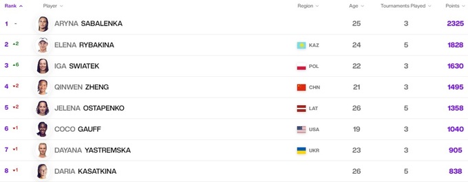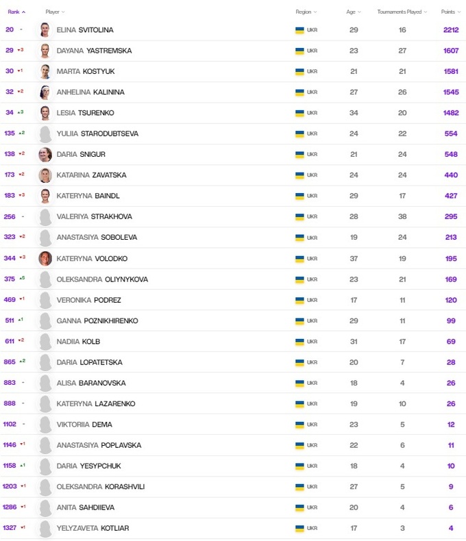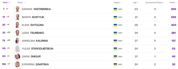 Даяна Ястремская в Чемпионской гонке уже седьмая, Марта Костюк опустилась на 14 место, Элина Свитолина осталась в топ-20. Неплохо добавили Леся Цуренко (+22 позиции) и Ангелина Калинина (+20). Стародубцева, Снигур и Завацкая немного потеряли.