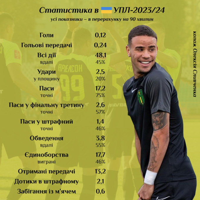 К зимней паузе Ариэльсон пришел с весьма скромными показателями результативности. В 13 поединках украинской Премьер-лиги за «Полесье» бразилец отличился лишь 1 забитым мячом и 2 ассистами. Впрочем, остальная статистика легионера выглядела вполне пристойной: он демонстрировал неплохую вовлеченность в командные действия, был нацелен на ворота соперников, активно боролся за мяч и достаточно успешно прибегал к использованию своей весьма неплохой техники.