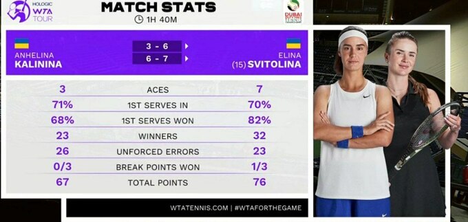 19 февраля в первом раунде хардового турнира серии WTA 1000 в городе Дубай (ОАЭ) состоялось украинское дерби между Элиной Свитолиной (WTA 20) и Ангелиной Калининой (WTA 32).