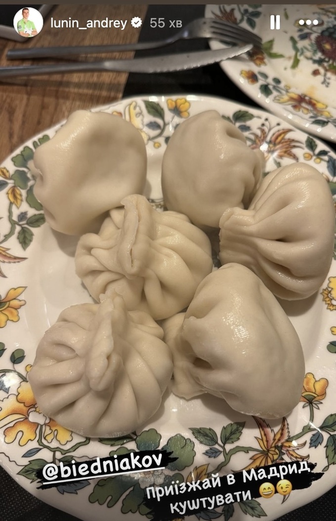 Лунин в своем инстаграме опубликовал сториз, на котором изображено грузинское блюдо хинкали. Андрей пригласил в Мадрид полакомиться блюдом известного украинского шоумена и футбольного болельщика Андрея Беднякова.