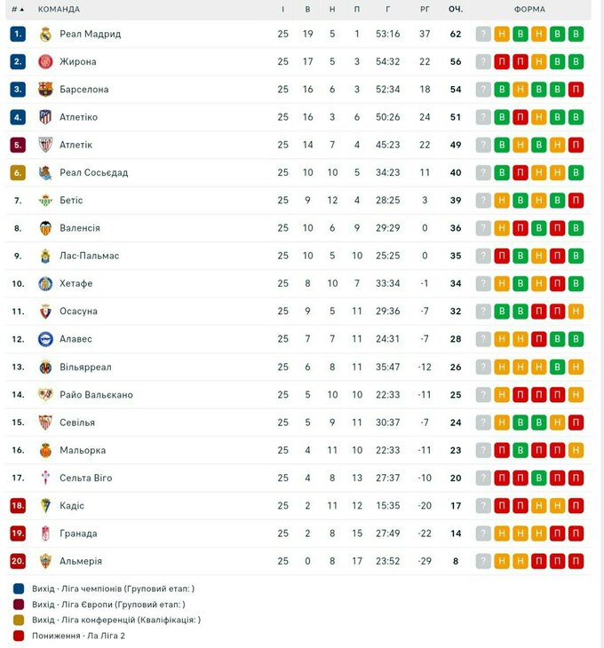Таблица Ла Лиги после 25-го тура