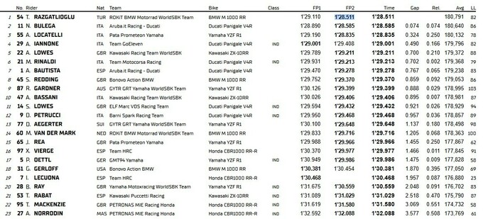 Второе место занял действующий чемпион мира в классе Supersport Николо Булега из заводской команды Дукати. Молодой итальянец, несмотря на аварию в 4-м повороте, стал единственным райдером, который выехал из 1 минуты и 29 секунд в обеих сессиях. Замкнул первую тройку Андреа Локателли из Ямаха, а среди райдеров частных команд лучшее время показал Андреа Янноне на Дукати команды GoEleven.