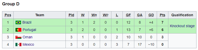 Из группы D в плей-офф пробились фавориты турнира – Бразилия, обыгравшая Мексику в овертайме (4:3 д.в.), и Португалия, взязшая верх над Оманом (3:2).