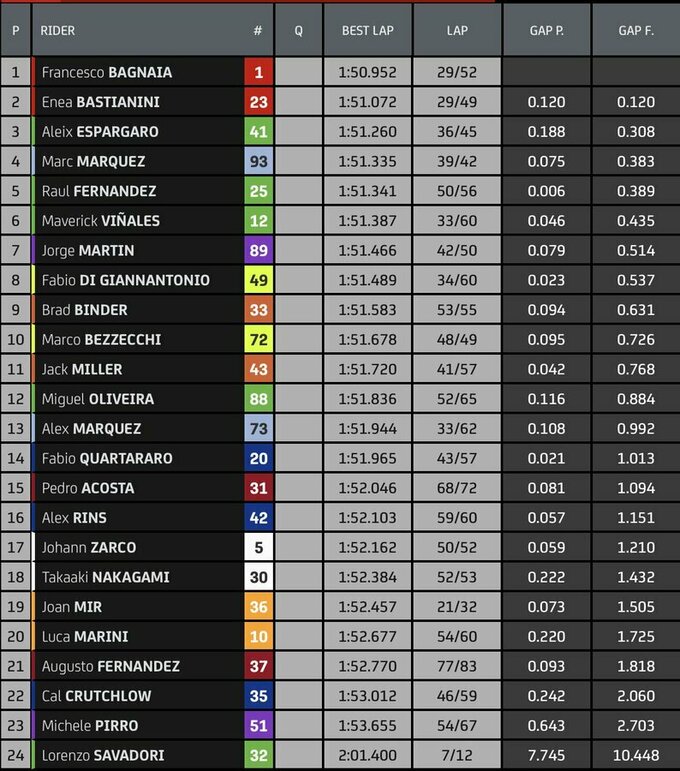 Топ-10: Баньяйя, Бастьянини, Эспаргаро, М. Маркес, Фернандес, Виньялес, Мартин, Ди Джаннантонио, Биндер, Бедзекки.
