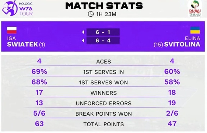 Это была 3-я встреча теннисисток, полька выиграла во второй раз. В предыдущем очном матче украинка добыла победу в 1/4 финала на Уимблдоне-2023.