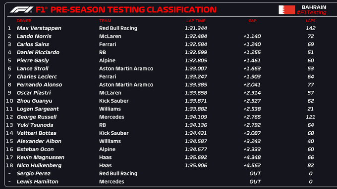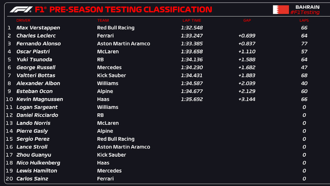 В дневной программе тестов лучшим снова был Ферстаппен, а топ-3 замкнули Ландо Норрис и Карлос Сайнс. Действующий чемпион опередил Норриса на 1,1 секунды.
