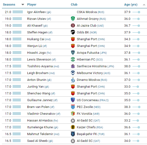 В список вошли футболисты, находившиеся в основной команде в течение самого длинного непрерывного периода.