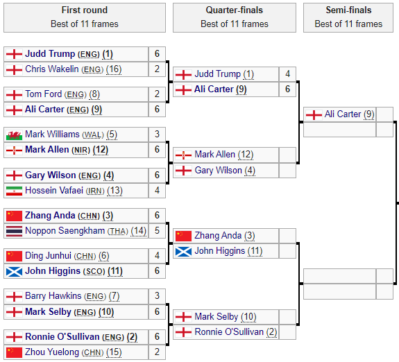 Картер теперь встретится либо с Марком Алленом, либо с Гэри Уилсоном в 1/2 финала. Он будет бороться за место в финале Players Championship второй год подряд. Картер играл в прошлом году в титульном матче, но проиграл Шону Мерфи со счетом 4:10.