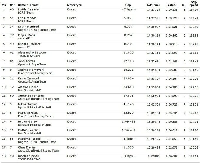 По итогу гонки длинной семь кругов Казадеи почти на шесть секунд опередил своего коллегу по команде Эрика Гранадо. Замкнул первую тройку Кевин Манфреди из SIC 58, который отстал от победителя почти на девять секунд.