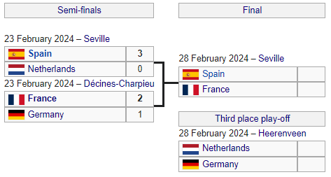 Теперь 28 февраля в финале в Севилье сыграют Испания и Франция, а бронзовые медали в Херенвене разыграют Нидерланды и Германии.