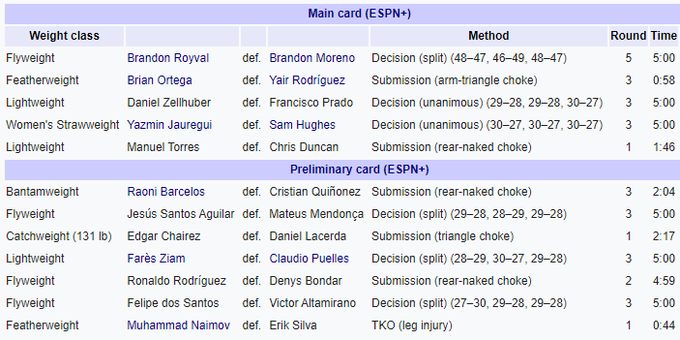 В главном бою встретились: Брэндон Морено (Мексика, 21–7–2) – Брэндон Ройвал (США, 15–7)