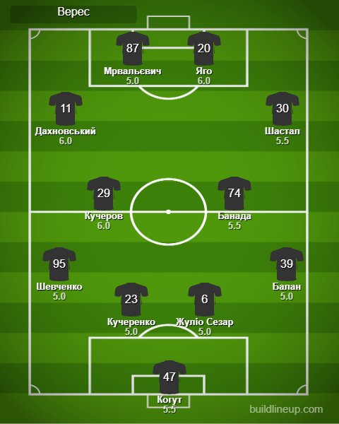 «Верес»: Когут, Балан (Гакман, 60), Кучеренко, Жулио Сезар, Шевченко, Банада, Кучеров, Шастал (В.Шарай, 60), Яго (Годя, 68), Мрвальевич (Гайдучик, 68), Дахновский (Янаков, 83).