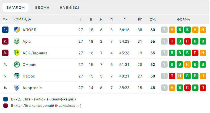 Сейчас «Омония» занимает в таблице плей-офф 4-е место с 52 очками. У лидера АПОЭЛя 60 пунктов.