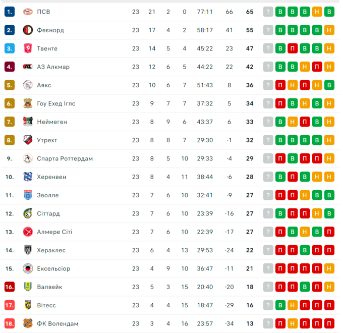 Также три очка заработали «Твенте» и «Витесс». Главный аутсайдер турнира «Волендам» дома опозорился в матче с «Херенвеном», пропустив аж 4 мяча.