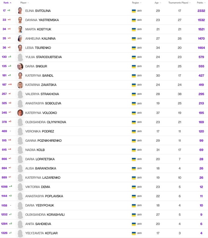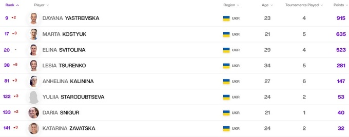 Элина Свитолина поднялась на 3 позиции и теперь 17-я. У остальных наших топов дела чуть хуже: Даяна Ястремская, Марта Костюк, Ангелина Калинина и Леся Цуренко потеряли несколько строчек и кучно расположились на местах с 33-го по 36-е. Юлия Стародубцева снова обновила личное достижение – теперь она 130-я. Немного улучшилось положение Дарьи Снигур и Катерины Байндл, 14 позиций потеряла Катарина Завацкая.