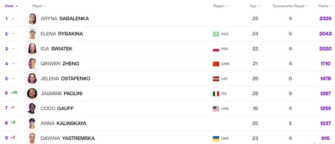 Три украинки остаются в двадцатке лучших в этом сезоне, но эта неделя никому не принесла продвижения выше. Также в сотне лучших находятся Цуренко и Калинина, но Ангелина довольно низко, если сравнивать с ее рейтингом.