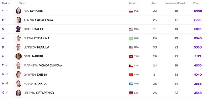Вернулась в первую десятку греческая теннисистка Мария Саккари, а травмированная Каролина Мухова покинула топ-10. Маркета Вондроушова поменялась местами с Чжэн Циньвень.