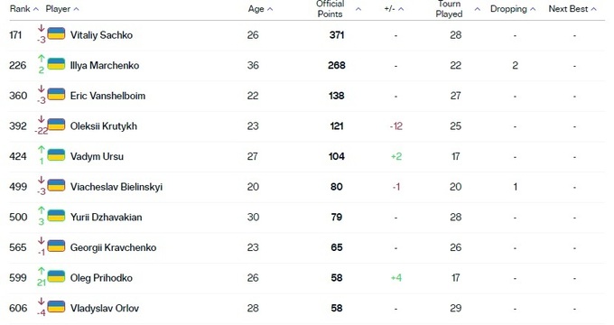 Что касается украинцев, то Виталий Сачко и Эрик Ваншельбойм потеряли по 3 позиции, Илья Марченко немного поднялся. Продолжается падение Алексея Крутых – минус 22 места. В очередной раз немного обновили свои достижения Вадим Урсу и Юрий Джавакян.