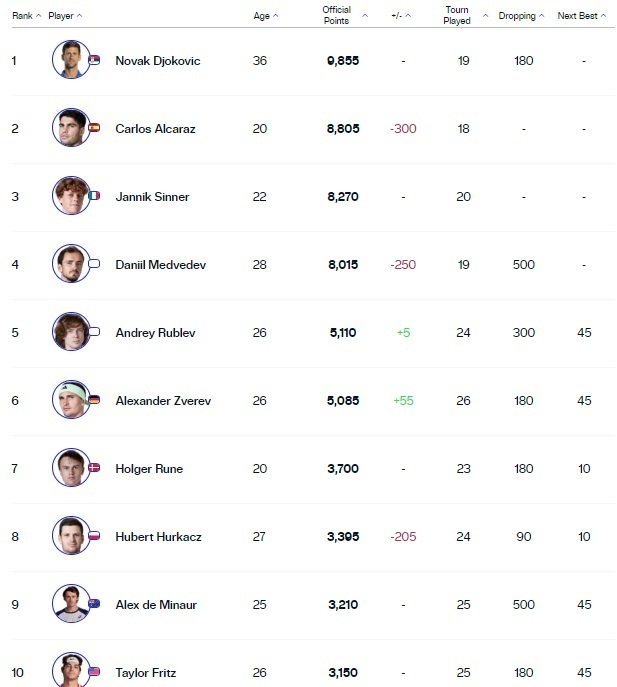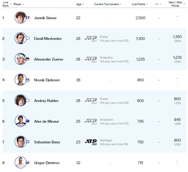 В Чемпионской гонке Баэс неожиданно ворвался в топ-8, вытеснив оттуда Хуркача. Алекса де Минаур опередил Григора Димитрова.