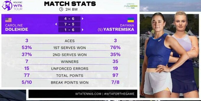Кэролайн Доулхайд (США) – Даяна Ястремская (Украина) [5] – 4:6, 7:5, 1:6