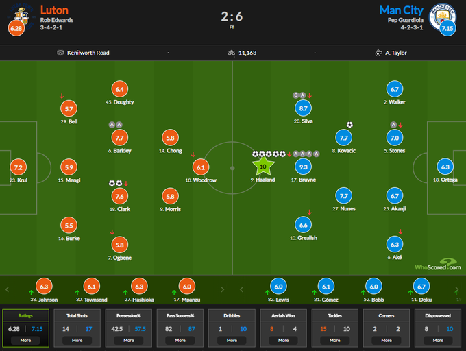 Нападающий «Манчестер Сити» Эрлинг Холанд за пента-трик получил от веб-портала WhoScored максимальную оценку 10.0.