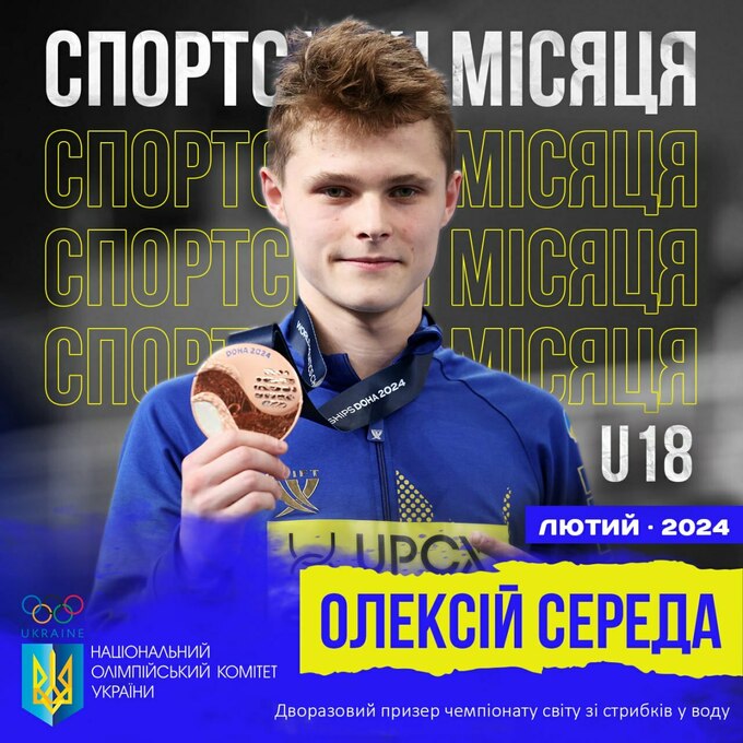 Лучшим юным спортсменом февраля 2024 стал Алексей Середа – двукратный бронзовый призер чемпионата мира по прыжкам в воду в индивидуальных и синхронных прыжках с 10-метровой вышки (Доха, Катар).