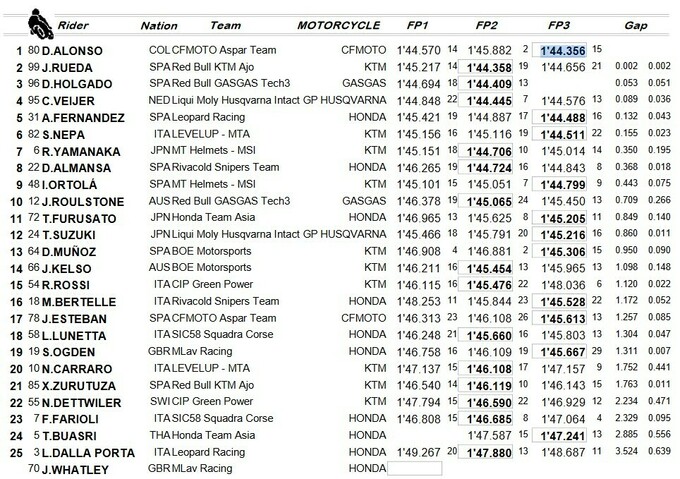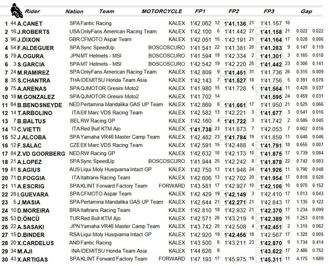 В первой и второй сессии в первую тройку входил Фермин Альдегер из Sync SpeedUp, которого слухи связывают с Pramac на следующий сезон MotoGP. Однако в заключительной сессии он показал четвертое время, которое стало его лучшим результатом дня.