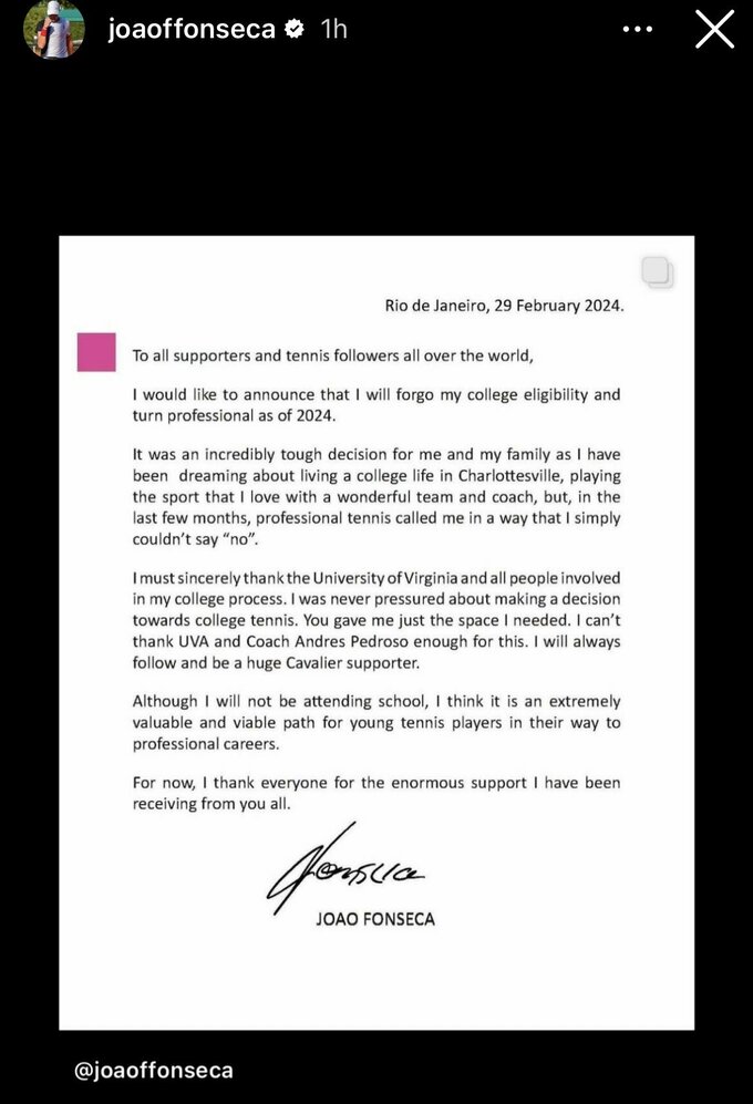 «Это было невероятно трудное решение для меня и моей семьи, поскольку я мечтал учится в колледже в Шарлоттсвилле, о спорте, который я люблю, с замечательной командой и тренером, но в последние несколько месяцев профессиональный теннис позвал меня так, что я просто не мог сказать «нет», – заявил Жоау.