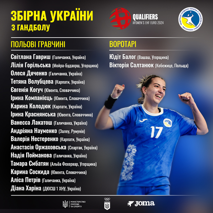 Із 18 гандболісток збірної України, які грали на ЧС-2023, зараз у складі – 9 спортсменок. Серед них: найкращий снайпер синьо-жовтих на ЧС, найкращий гравець України 2023 року – розігруюча Тамара Смбатян, центральна захисниця Ірина Компанієць, а також досвідчені голкіперки Вікторія Салтанюк та Юдіт Балог.
