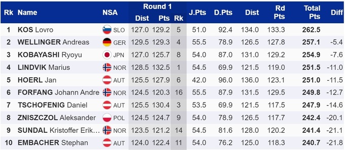 Кос опередил немца Андреаса Веллингера и японца Рёю Кобаяси. Лидер Кубка мира, Штефан Крафт, показал лишь 49-й результат.