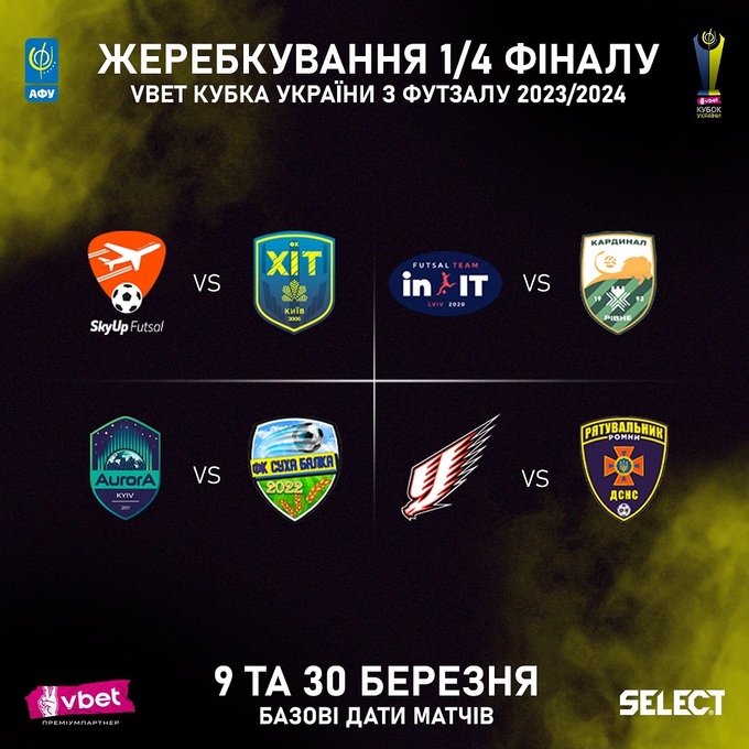 Состоялась жеребьевка четвертьфинала Кубка Украины 2023/24 по футзалу, по результатам которой восемь команд были разделены на четыре пары: