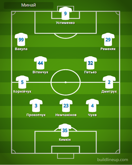 «Минай»: Кемкин – Корнийчук, Прокопчук, Немчанинов (Скиба, 46), Чуев, Дмитрук – Вакула (Матюшенко, 77), Петько (Семотюк, 64), Витенчук, Ременяк (Гуничев, 77) – Устименко (Попов, 78).