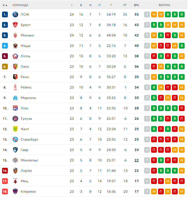 Лидеры: ПСЖ (55), Брест (43), Монако (42), Ницца (40), Лилль (38), Ланс (36), Ренн (35), Реймс (34), Марсель (33).
