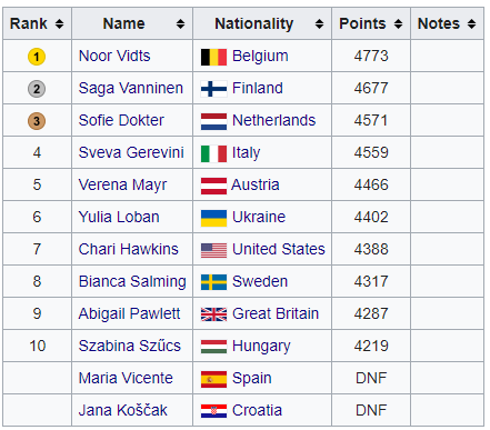 В топ-3 вошли: Ноор Видц (Бельгия) – 4773, Сага Ваннинен (Финляндия) – 4677, Софи Доктер (Нидерланды) – 4571.