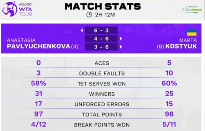 Анастасия Павлюченкова [4] – Марта Костюк (Украина) [6] – 6:3, 4:6, 3:6