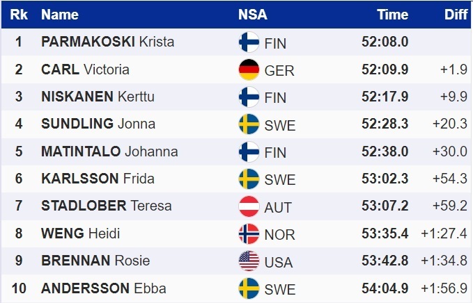 Компаню на подиуме ей составили немка Виктория Карл и партнерша по команде Кертту Нисканен. Лидер Кубка мира, американка Джессика Диггинс, показала только 21-й результат.