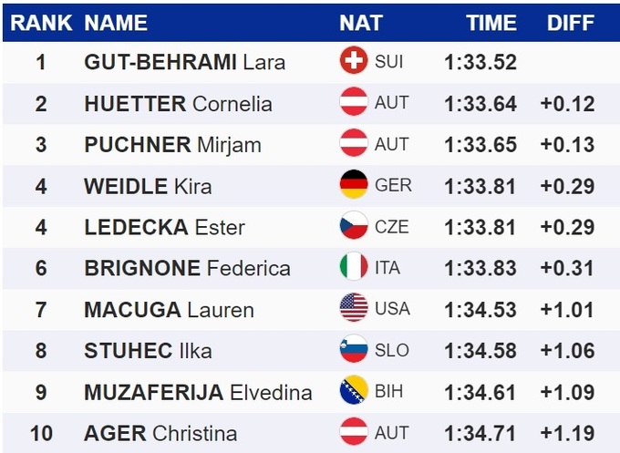 Эта победа позволила Гут-Бехрами увеличить свое преимущество в общем зачете над Микаэлой Шиффрин до 305 очков за 7 стартов до завершения сезона.