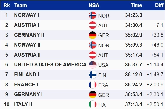 Несмотря на отсутствие лидера команды, Ярла Магнуса Риибера, норвежцы опередили сборные Австрии и Германии.
