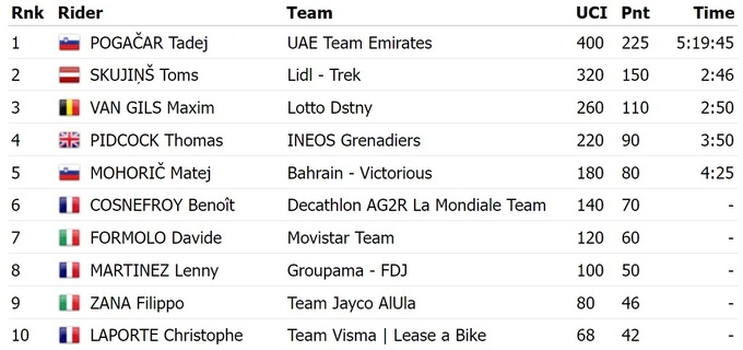 Вторым финишировал латвиец Томс Скуйиньш из команды «Lidl Trek», топ-30 замкнул бельгиец Максим Ван Гилс из «Lotto Dstny».