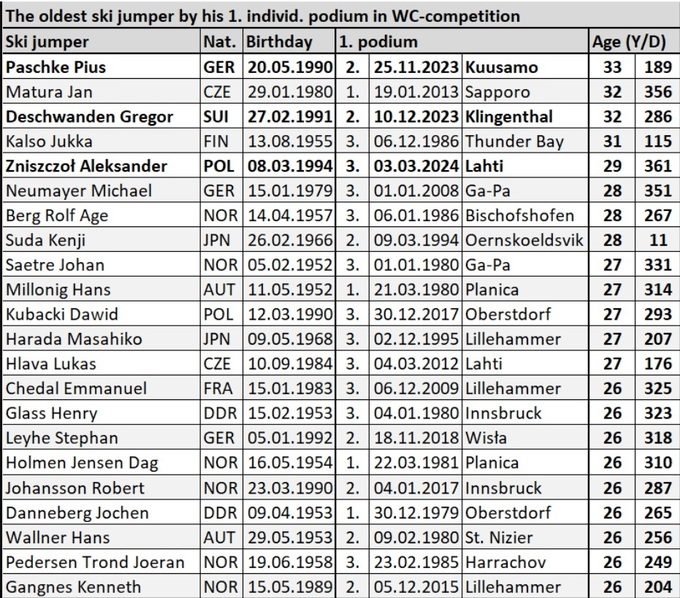 За всю историю Кубка мира лишь четыре прыгуна добрались до своего первого в карьере подиума на Кубке мира в более солидном возрасте, чем Знищоль. При чем, первый и третий результаты в этом рейтинге были установлены в нынешнем сезоне – Пьюсом Пашке и Грегором Дешванденом соответственно. Очередное доказательство того, насколько «повзрослели» мировые прыжки за последние годы.