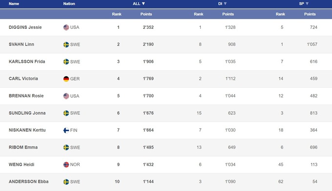 Воскресный личный спринт для шведок также завершился неожиданным фиаско: победу одержала Кристин Шистад, а Сван и Сундлинг вышли в финал только в качестве лаки-лузеров, и в решающем забеге остались за пределами подиума. Особенно обидно должно быть Сван, у которой внезапно открылись перспективы борьбы за Большой хрустальный глобус (БХГ).