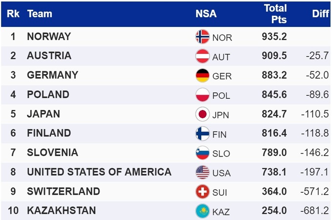 Норвежцы на 25,7 балла опередили команду Австрии, топ-3 замкнула сборная Германии.